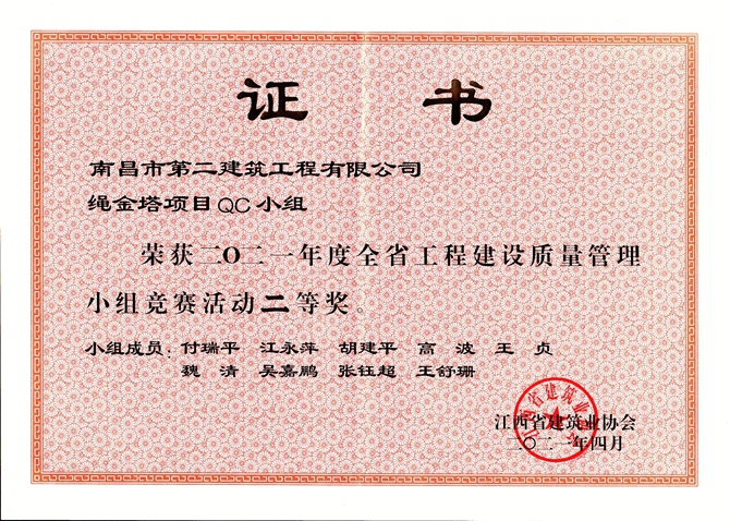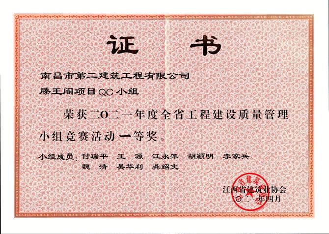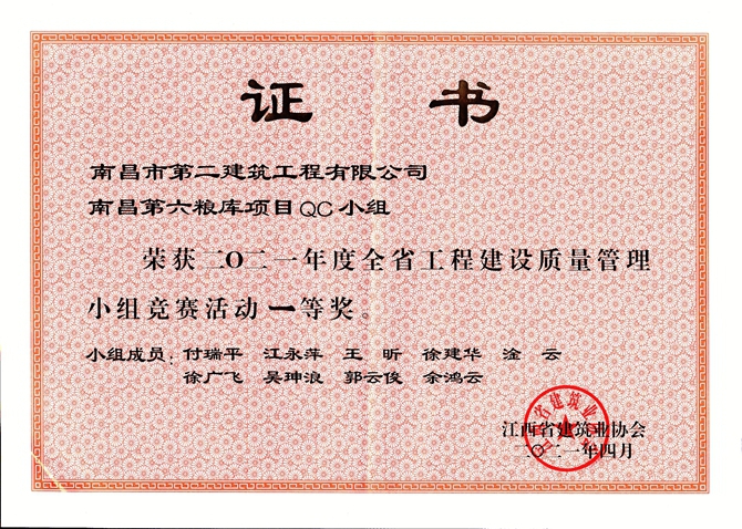 4月27日,江西省建筑业协会召开全省建筑业全面质量管理成果发布会,我司报送参赛的南昌第六粮库项目QC小组的《提高软弱地基强夯施工一次验收合格率》QC成果和滕王阁项目QC小组的《提高古建砼戗梁验收合格率》QC成果获得一等奖,绳金塔项目QC小组的《提高高空弧形挑檐施工质量》QC成果获得二等奖,为促进企业技术创新和科技进步、提升企业品牌形象添劲加力。