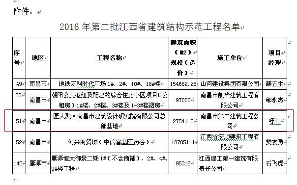 公司匠人聚?南昌市建筑设计研究院有限公司总部基地工地荣获2016年第二批江西省建筑结构示范工程称号