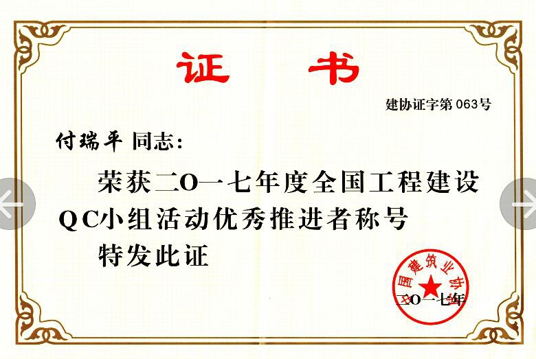 在中国建筑业协会组织的2017年度QC成果发布会上,公司QC小组的《提高GC发泡水泥保温板外墙外保温施工质量》成果荣获2017年度全国工程建设质量管理小组活动优秀成果奖;付瑞平同志荣获2017年度全国工程建设QC小组活动优秀推进者称号。