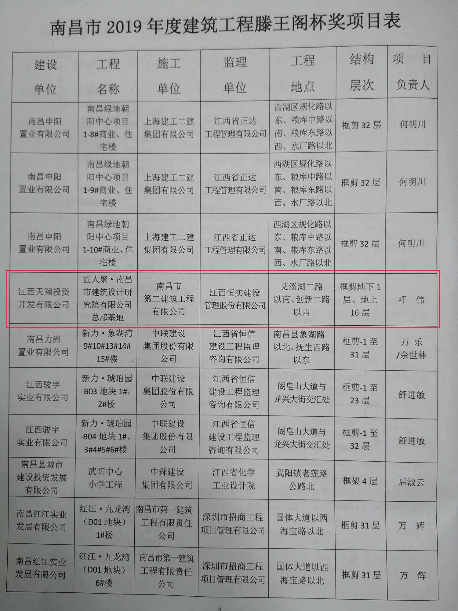 会上宣布了《关于表彰2017——2018年度南昌市建筑业先进企业和优秀建造师(监理师)的通报》和《南昌市2019年度建筑工程滕王阁杯奖表彰决定》,我司荣获了先进企业荣誉称号,吁伟同志荣获了优秀建造师荣誉称号,匠人聚.南昌市建筑设计研究院有限公司总部基地项目荣获滕王阁杯奖。