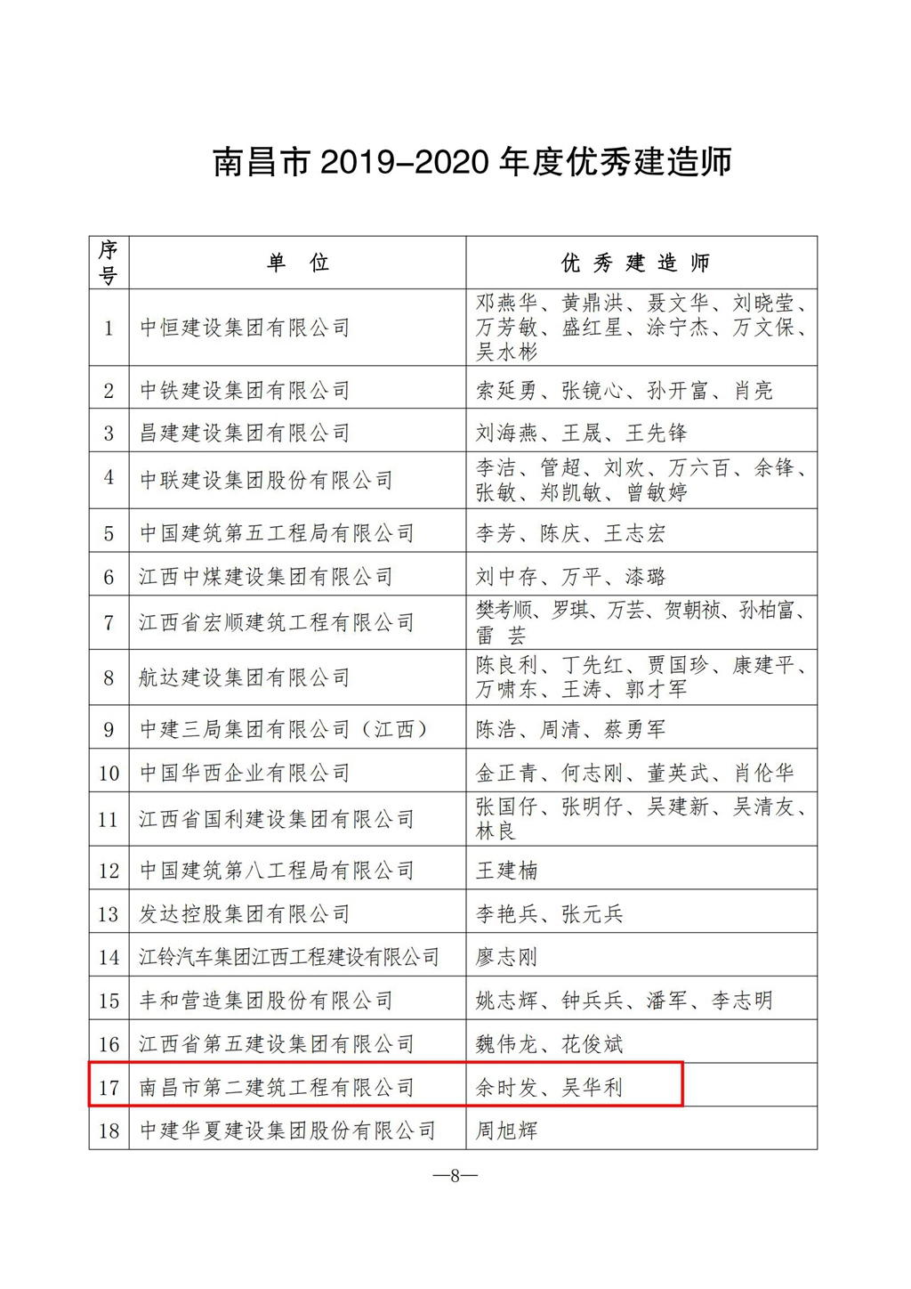 为表彰先进、树立典型,鼓励建筑业做大做强,着力推动我市建筑业快速健康发展,南昌市建筑业协会开展全市 2019—2020 年度南昌市建筑业先进企业和优秀建造师(监理师)评选活动。经企业申报、市建协评审、综合市建设局相关职能部门意见,共有 82 个单位被评为南昌市建筑业先进企业 ,151 名建造师被评为南昌市建筑业优秀建造师,其中,我公司再次获评市“先进企业”、余时发和吴华利被评为市“优秀建造师”称号,并受到表彰。